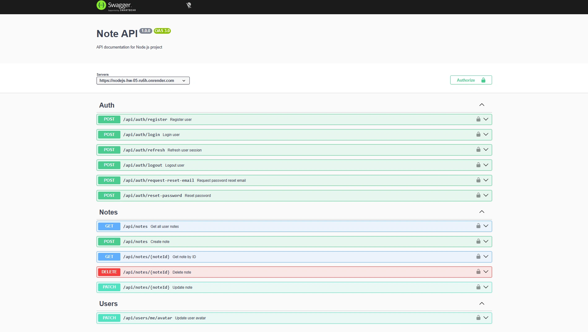 Node.js NoteHub API is a RESTful backend service with JWT-based authentication, protected CRUD operations for notes, and avatar upload support. The API is fully documented with Swagger (OpenAPI 3.0) and deployed on Render, providing an interactive /api-docs interface for testing and exploration.